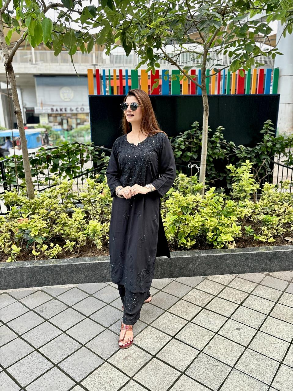 Introducing Classikari Rayon Mukesh set with a long kurta with chikankari hand embroidery with a relaxed fit plazzo .